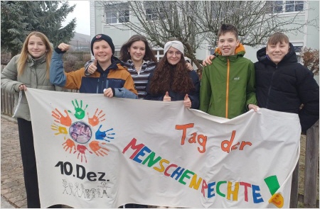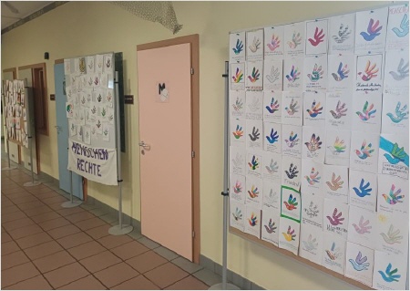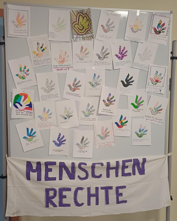 Zum Jahrestag der Menschenrechte am 10.Dezember gestalteten alle (!) Schülerinnen und Schüler der Schule die Silhouette des Logos für die "Human Rights" und formulierten ihre Gedanken dazu.