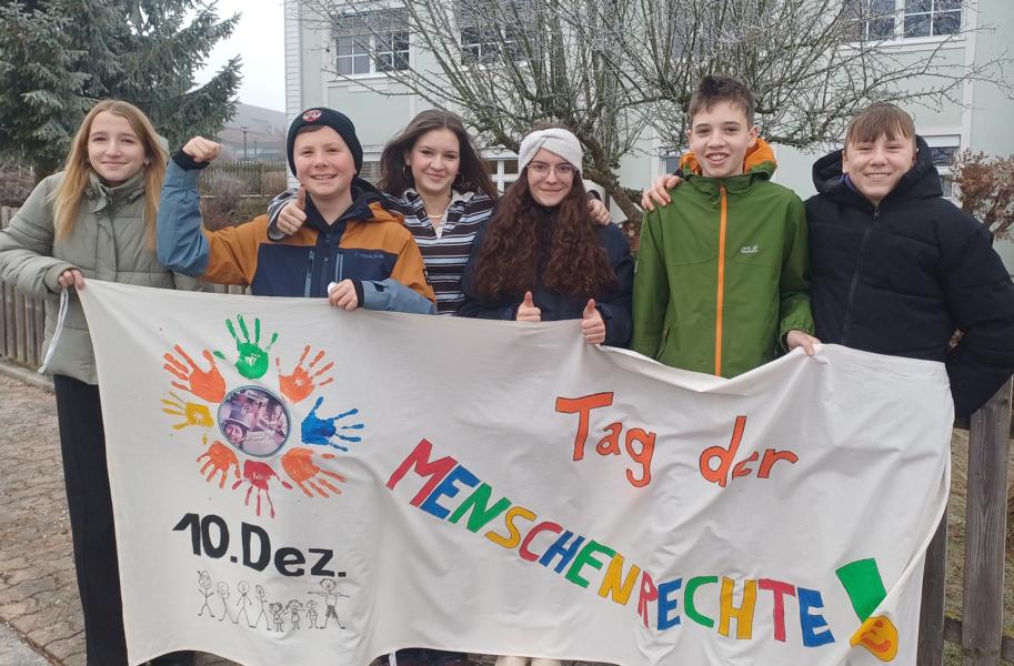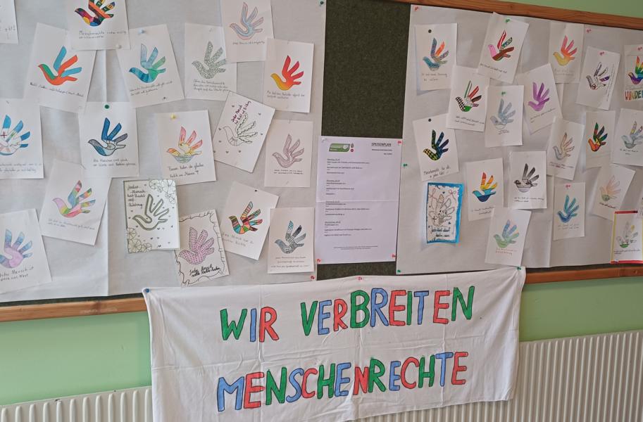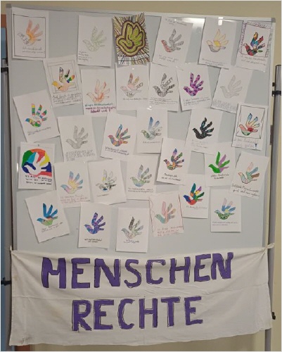 Zum Jahrestag der Menschenrechte am 10.Dezember gestalteten alle (!) Schülerinnen und Schüler der Schule die Silhouette des Logos für die "Human Rights" und formulierten ihre Gedanken dazu.